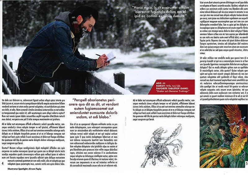 This was to be the cover page of a magazine, as part of a student project, the content of which we the students were to chose for ourselves (cover art by Paul Bonner for the Riotminds campaign book Snösaga). The assignment prompted us to create a magazine we would read and that covered a topic we would be interested in. Being a bit of a nerd myself, I set out to create "Tabletopper", a magazine in which I could read about nerdy board games and highlight an often underappreciated profession; the artists and illustrators that help bring these settings to life.