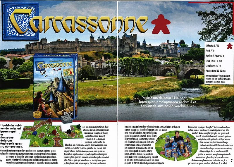 Let's talk about the board game of the month. A section most people would expect in a magazine called "Tabletopper", I imagine. Although there were many candidates for this section, I had to chose one which I adore myself for this first (and only) issue. Carcassone. A beloved classic and rightfully so, in my opinion. Easy to pick up and understand yet behind this simple facade hides an incredibly in depth and intricate game which allows new players to play it and understand the rules immediately, but it keeps the interests of veterans by allowing true skill and experience to be rewarded by understanding the ins and outs of the game. For my purposes I needed to promote the historical background, emphasizing the aesthetics of the game and creating a reoccurring element which quickly would draw in the uninitiated and give them a quick overview of the featured game.