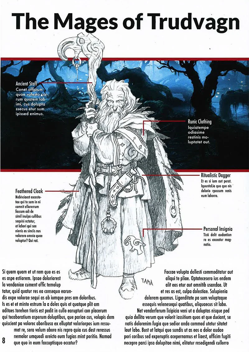 This was to be the final page. It features an illustration from Tapia and would’ve given a brief insight into how the illustration fleshes out the worldbuilding of the game and how the lore of the game complements the illustration. While the font choice is hardly a favorite of mine nowadays it is the same font used in the beloved "The Elder Scrolls V: Skyrim" as I imagine a lot of my readers would be familiar with it and perhaps subconsciously associate the magazine and game.